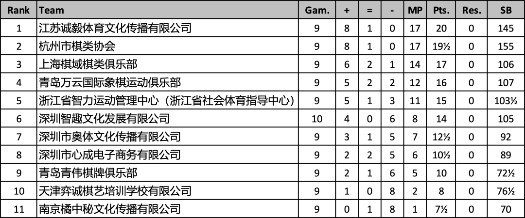 上海棋域棋类俱乐部以6胜2平1负积14分,基本锁定季军。青岛万云国际象棋运动俱乐部5胜2平2负积12分位列第四。