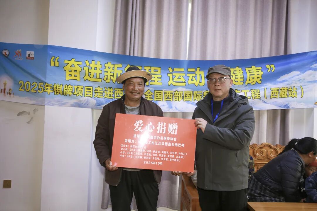 10月29日是中国传统的重阳节。就在这一天,“奋进新征程 运动促健康”2025年棋牌项目走进西部暨全国西部国际象棋推广工程(西藏站)一行来到海拔近3500米的林芝市工布江达县措高乡结巴村,手把手教授国际象棋,捐赠棋具,将这项智慧运动的种子播撒到乡村。国家体育总局棋牌运动管理中心国际象棋部主任、中国国际象棋协会常务理事田红卫,中国国际象棋协会裁判竞赛委员会副主任王浩丞,西藏自治区棋类协会会长赵钧,中国棋院杭州分院智力运动管理处副处长、国际象棋女子国际大师俞婷,国际象棋特级大师、高级教练马群将对弈方法和棋具带给这里的村民。措高乡党委委员、政府副乡长闫亮对“西部行”代表团的到来表示热烈欢迎和衷心感谢。