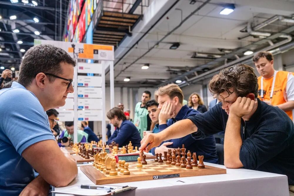 赛后卡尔森说,他和队友没有住在一个酒店,本来要和队伍一起乘车来赛场,但队友说今天下雨布达佩斯堵车很严重,没法过来接他。卡尔森只好找了一辆自行车赶往赛场(此时距离比赛还有18分钟),路上还有点迷路,最终凭借导航才赶到了赛场。到达赛场后,发现找不到赛场入口,而且自己的标牌还在队长那里,最终靠记者艾米莉亚诺娃的引领,被匆匆带入了赛场…卡尔森说:“他们一直说我在导航方面很糟,我想这是我应该改进的地方。如果导航顺利的话,今天就会容易很多。但总的来说,今天还是美好的一天,希望我们第四轮也能赢…”三轮过后,男子组共有16支队伍取得三连胜,分别是印度、美国、乌兹别克斯坦、中国、越南、阿塞拜疆、波兰、西班牙、乌克兰、亚美尼亚、立陶宛、瑞典、匈牙利一队、意大利、黑山和塞尔维亚。