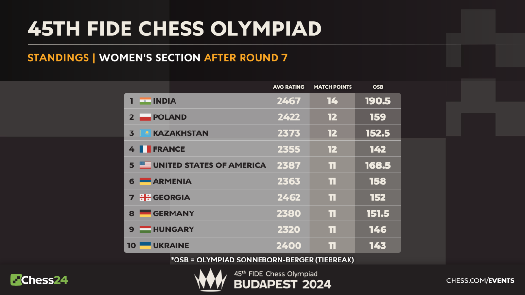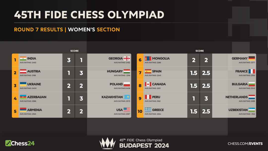 最晚结束的战斗来自韦奕和世界冠军挑战者古克什。两人在经过复杂的中局争夺后,在第一时限临近时转入白方双马三兵对黑方车三兵的残局。尽管计算机认为局面大致相当,但对于执黑的韦奕来说,压力要更大一些。残局争夺中,古克什不断地给韦奕施压,韦奕一直应对得当,但可惜的是,在第二时限进入时间紧张状态时,韦奕出现了失误,最终导致局势恶化,于第80回合遗憾失利…值得一提的是,本局古克什获胜后,其实时等级分升至2780分,排名冲进了世界前五。男子组其他比赛中,除了七连胜的印度男队之外,伊朗男队本轮2.5比1.5击败黑马越南男队,继续紧追领头羊。四台艾达尼战胜新秀班嘉辉,为本队获胜立了头功。上届冠军乌兹别克斯坦男队3比1力克乌克兰男队;荷兰男队1比3不敌塞尔维亚男队,东道主匈牙利男队2.5比1.5战胜立陶宛男队;亚美尼亚男队2.5比1.5小胜英格兰男队。罗马尼亚男队3比1击败波兰男队;前世界棋王卡尔森本轮击败特级大师德拉戈涅夫,帮助本队以3比1拿下奥地利队。七轮过后,印度男队七连胜,场分14分,继续领先。伊朗队六胜一平场分13分,紧随其后。乌兹别克斯坦、匈牙利、亚美尼亚和塞尔维亚场分同积12分,中国五胜一平一负场分11分,同分的还有美国、越南、格鲁吉亚、挪威、法国和罗马尼亚。
