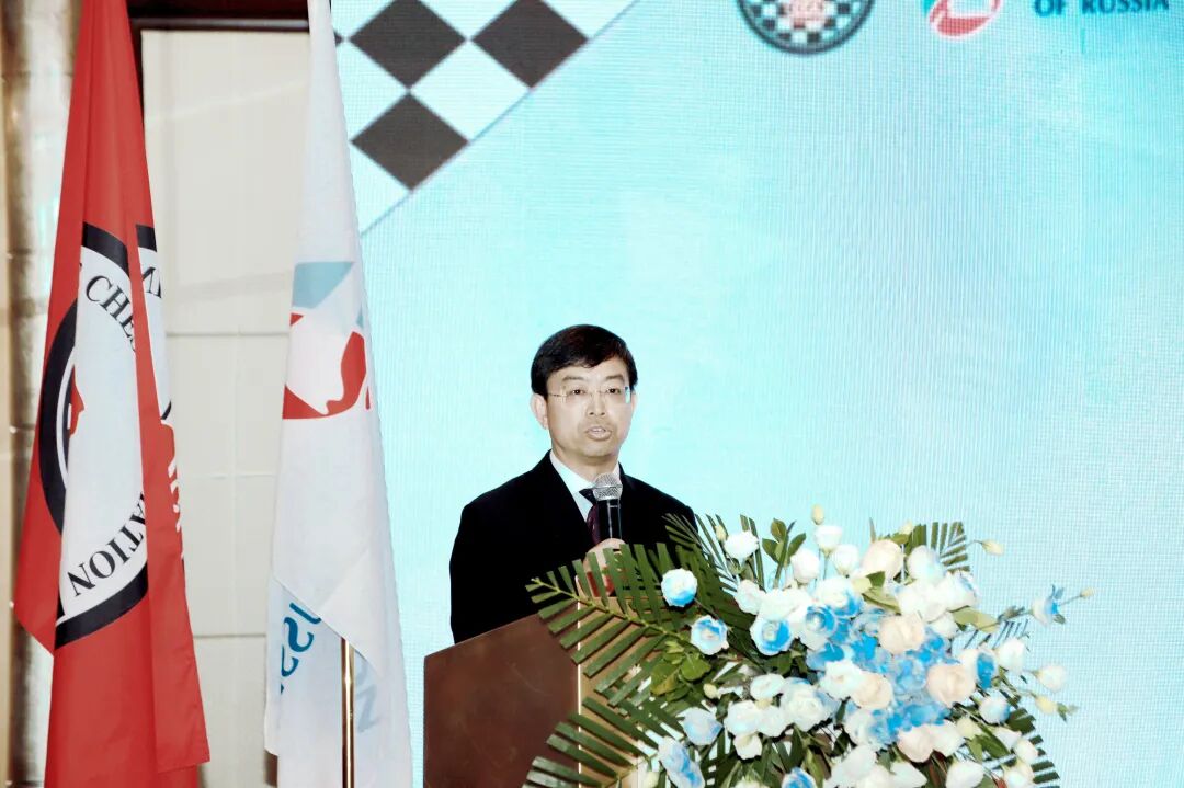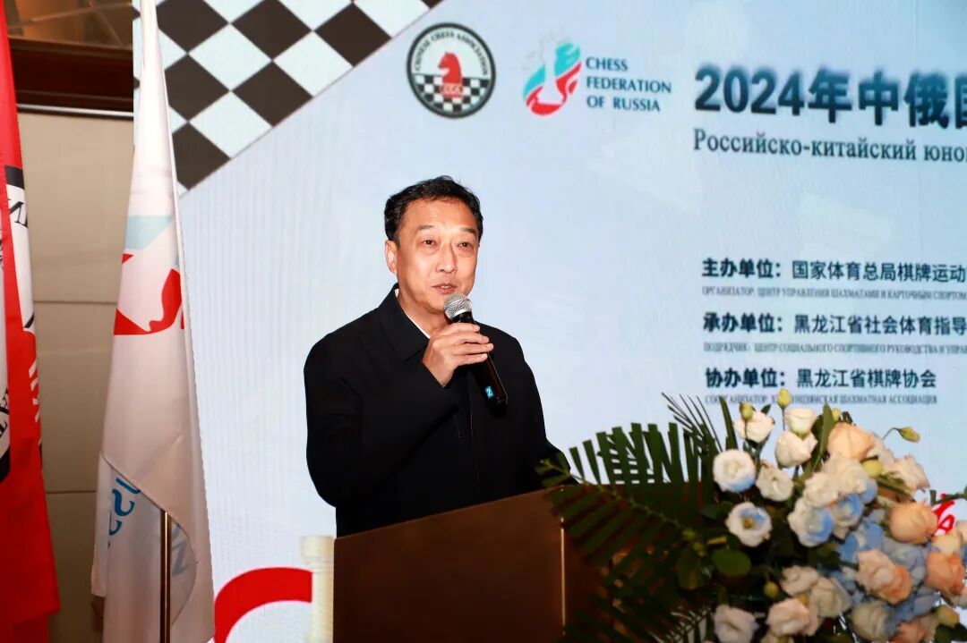 郭玉田致欢迎词,他表示:“今年是中俄建交75周年,两国元首三度会晤,为中俄关系的发展作出顶层设计和战略部署。体育作为促进国际交流与合作的重要桥梁,在推动文明互鉴、促进民心相通等方面发挥着独特的作用。相信通过本次比赛的举办,将进一步加深中俄两国青少年之间的了解和友谊,推动中俄地方间的务实合作,助力国际象棋项目更好地在我省普及开展。”