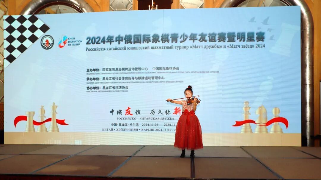 开幕式前哈尔滨市江沿小学学生代表为前来参赛的中俄棋手举行文艺表演。
