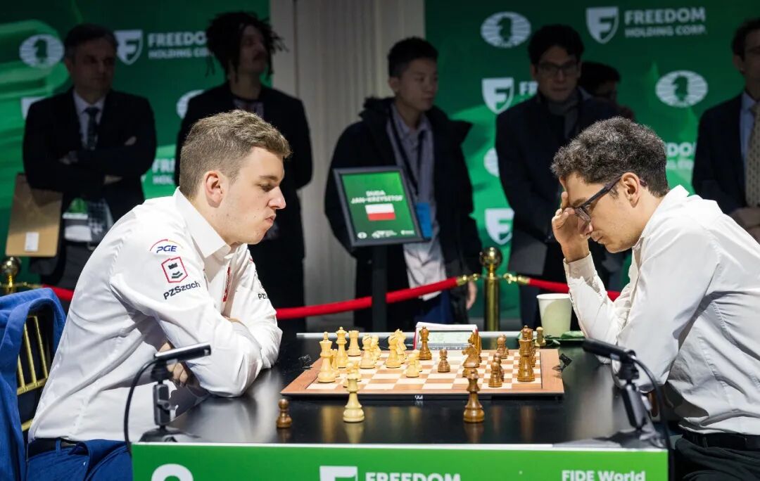 男子组比赛中,涅波姆尼亚奇(俄罗斯)、卡鲁阿纳(美国)、卡尔森(挪威)、苏伟利(美国)、菲罗贾(法国)、尼曼(美国)、杜达(波兰)和穆尔钦(俄罗斯)八人在13轮瑞士制比拼后突出重围,进入了今天的淘汰赛。他们按照蛇形编排,捉对厮杀。