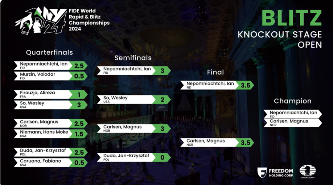 这样,超快棋世锦赛历史上第一次出现了并列冠军!卡尔森和涅波共享这份荣耀!半决赛落败的杜达和苏伟利,并列获得铜牌。