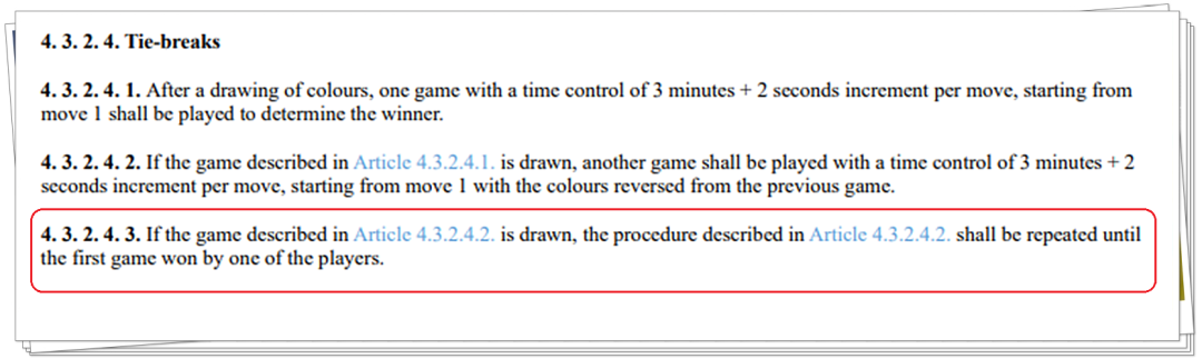 根据竞赛规程第1.4款(即:任何本规程未涵盖的情况或不可预见的情况,应提交国际棋联主席作出最终决定),双方的请求被发送给了国际棋联主席德沃尔科维奇。主席接受了这一提议,同意两人并列冠军,且不授银牌。得到主席确认后,卡尔森和涅波拥抱在一起,共同庆祝这一难忘时刻。